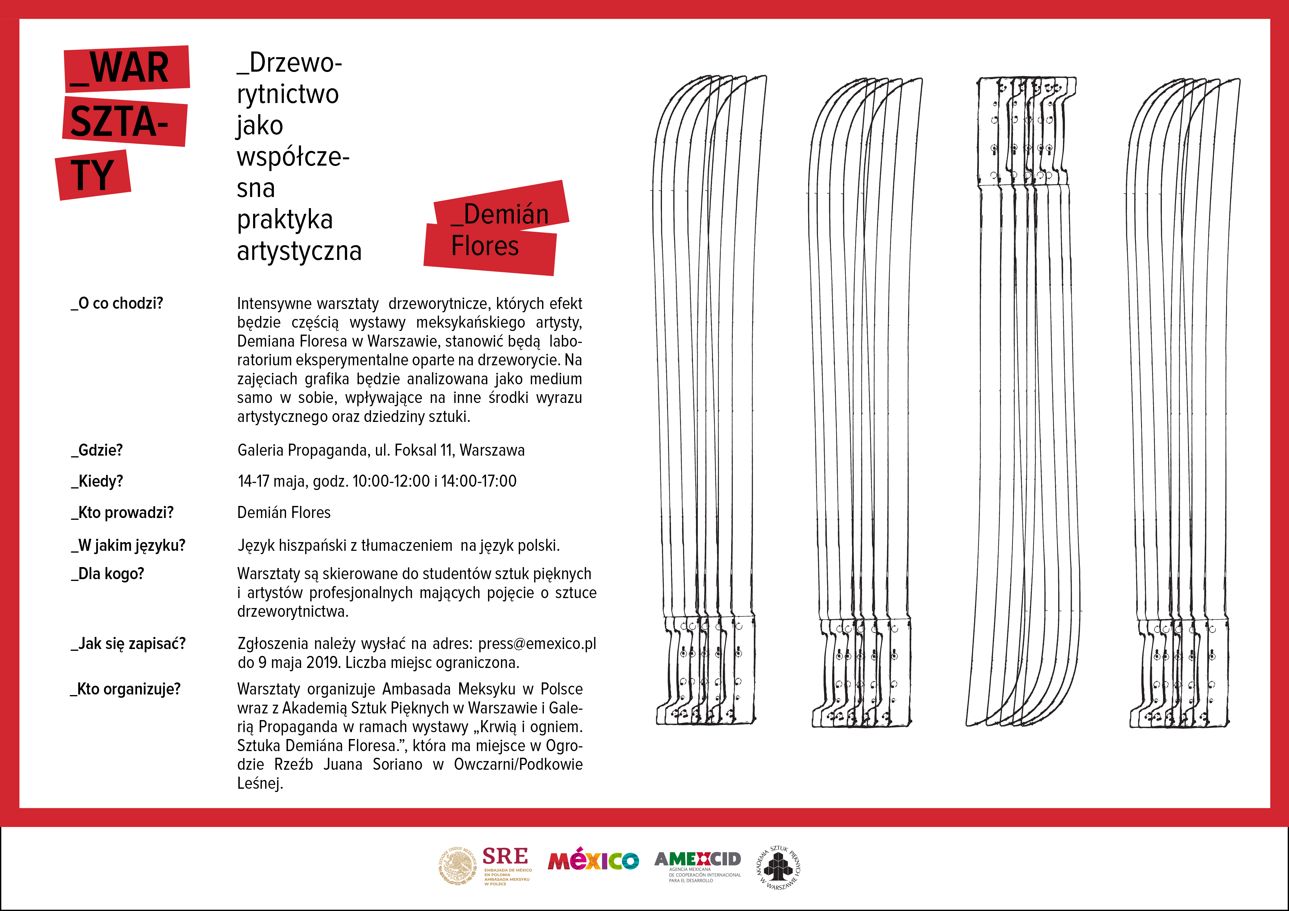 Ambasada Meksyku w Polsce wraz z Galerią Propaganda organizują warsztaty drzeworytnicze z udziałem Demiana Floresa, meksykańskiego artysty, którego wystawa „Krwią i ogniem” będzie miała miejsce w Ogrodzie Rzeźb Juana Soriano w Podkowie Leśnej/Owczarni w maju br. Artysta w swoich pracach używa różnych technik graficznych, a drzeworytnictwo i litografia są mu szczególnie bliskie. Tematyka jego prac oscyluje natomiast wokół kwestii tożsamości, historii, pamięci i tygli kulturowych. Na zajęciach studenci będą zgłębiać tajniki sztuki drzeworytniczej, a efekt ich pracy stanie się dopełnieniem wystawy Demiana.